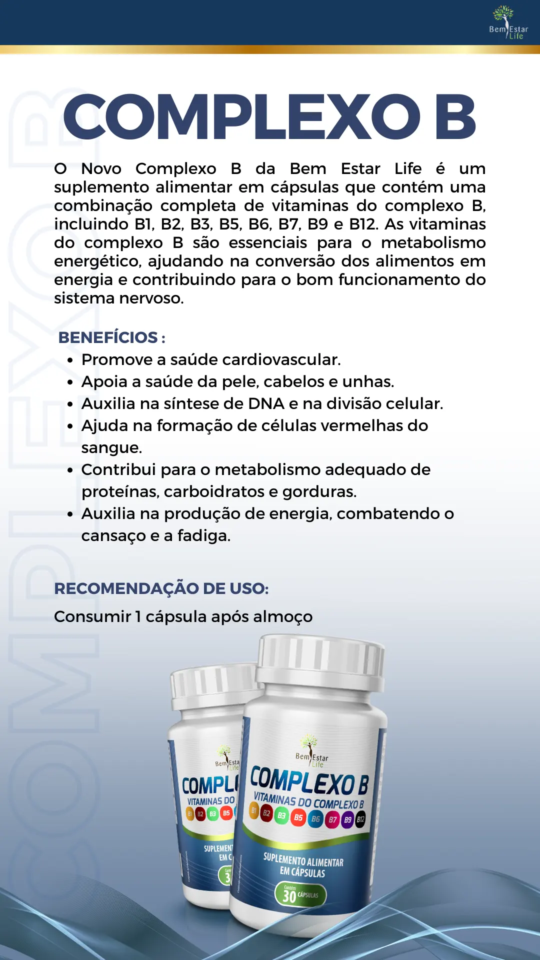 • Novo Complexo B da Bem Estar Life é um suplemento alimentar em cápsulas que contém uma combinação completa de vitaminas do complexo B, incluindo B1, B2, B3, B5, B6, B7, B9 e B12. As vitaminas do complexo B são essenciais para o metabolismo energético, ajudando na conversão dos alimentos em energia e contribuindo para o bom funcionamento do sistema nervoso.