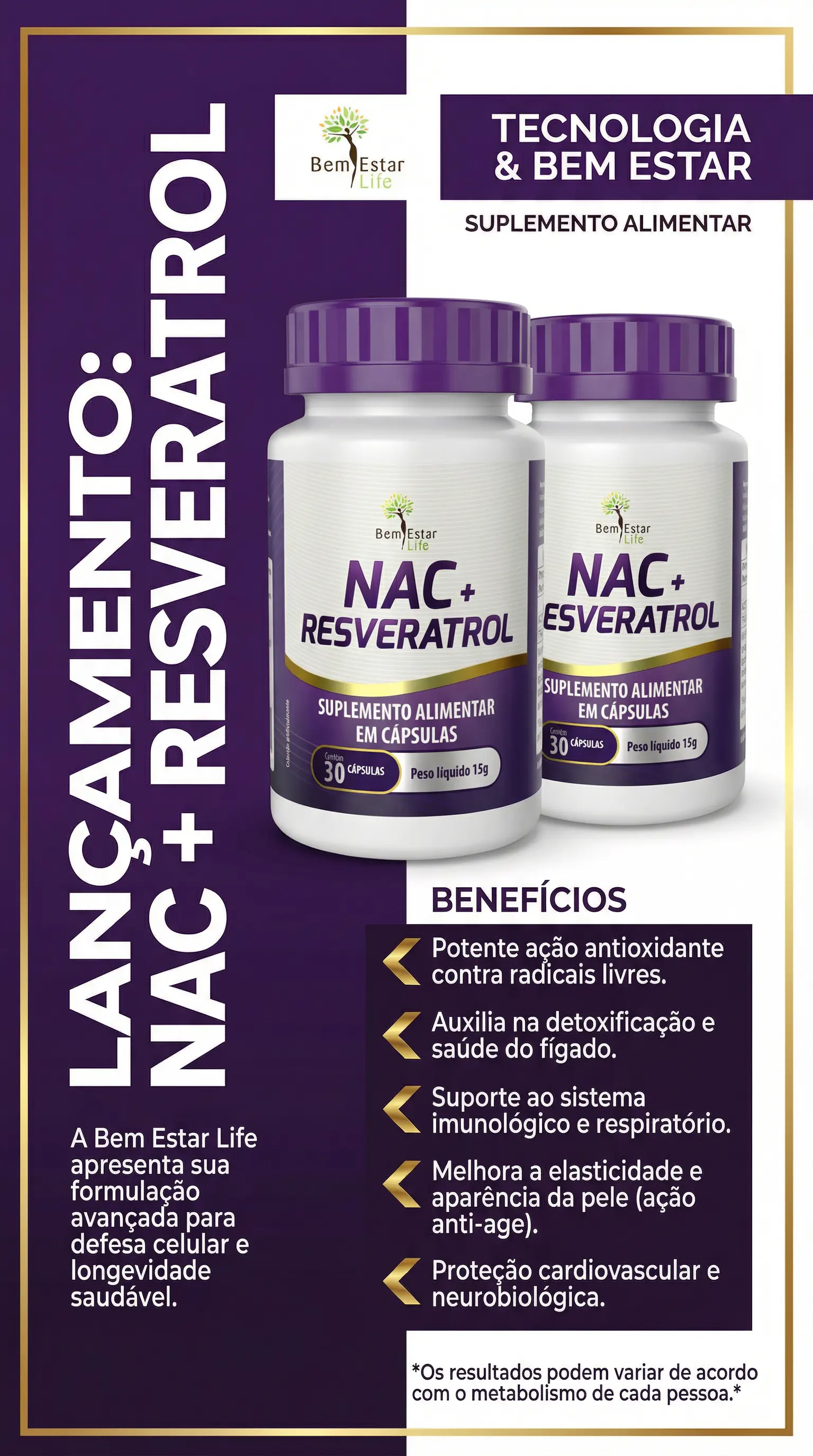 Apresentamos a sinergia mais avançada do mercado: o novo NAC + Resveratrol da Bem Estar Life. Uma fórmula exclusiva criada para agir direto na raiz do problema.