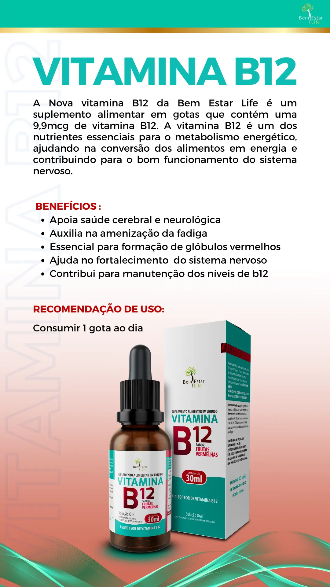 A Nova vitamina B12 da Bem Estar Life é um suplemento alimentar em gotas que contém uma 9,9mcg de vitamina B12. A vitamina B12 é um dos nutrientes essenciais para o metabolismo energético, ajudando na conversão dos alimentos em energia e contribuindo para o bom funcionamento do sistema nervoso.